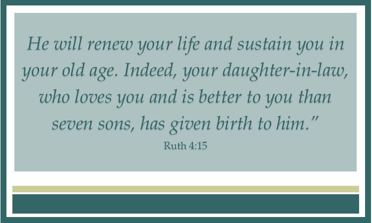 Today, we are going to focus on God’s promising of renewal and redemption. This verse is probably a a few praises from the women surrounding her as she held her grandson.