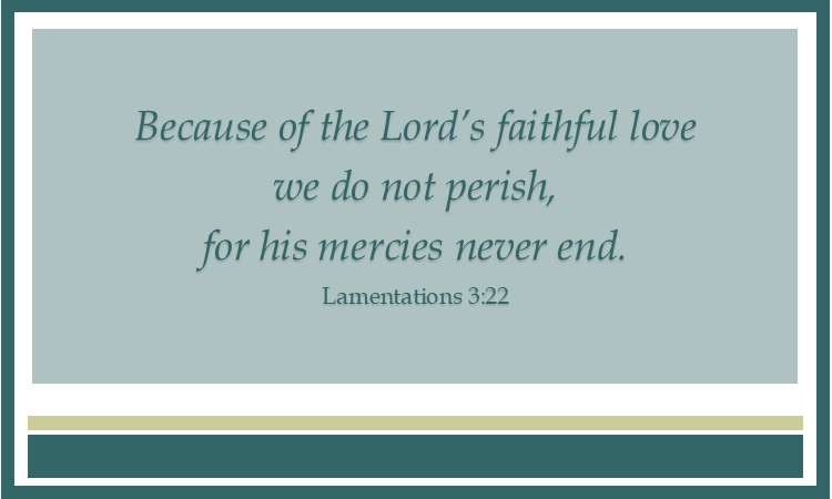 When we look at the whole of Lamentations, these verses are significant because the book shows the desolation and despair God’s people were experiencing following the destruction of Jerusalem. We can relate as we may find ourselves in complete ruin. Yet in the middle of this book, in the middle of our own consequences and experiencing the deep sorrow and mourning of our sin, we can experience God’s steadfast love and faithfulness.