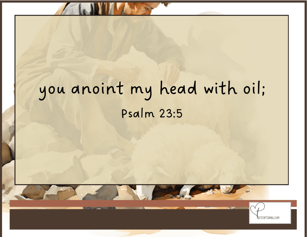 They would put oil in the ears and nostrils of sheep so that flies could not lay their eggs in their noses or ears. If a fly did, when the eggs hatched, they would crawl deep into the ears and nasal cavities of the flies. The pain and discomfort would cause the sheep to forcefully hit their heads against trees and rocks. This resulted in severe injury or death. Shepherds also put oil in the wounds of sheep to help heal wounds to prevent infection and infestation of disease and flies. Their eyes were also suspectable to annoying insects. Spend a little time around livestock and you notice flies and insects hang out around the eyes of livestock. They do not have hands to swipe them away. The oil was a barrier of protection against harmful things hurting the sheep.