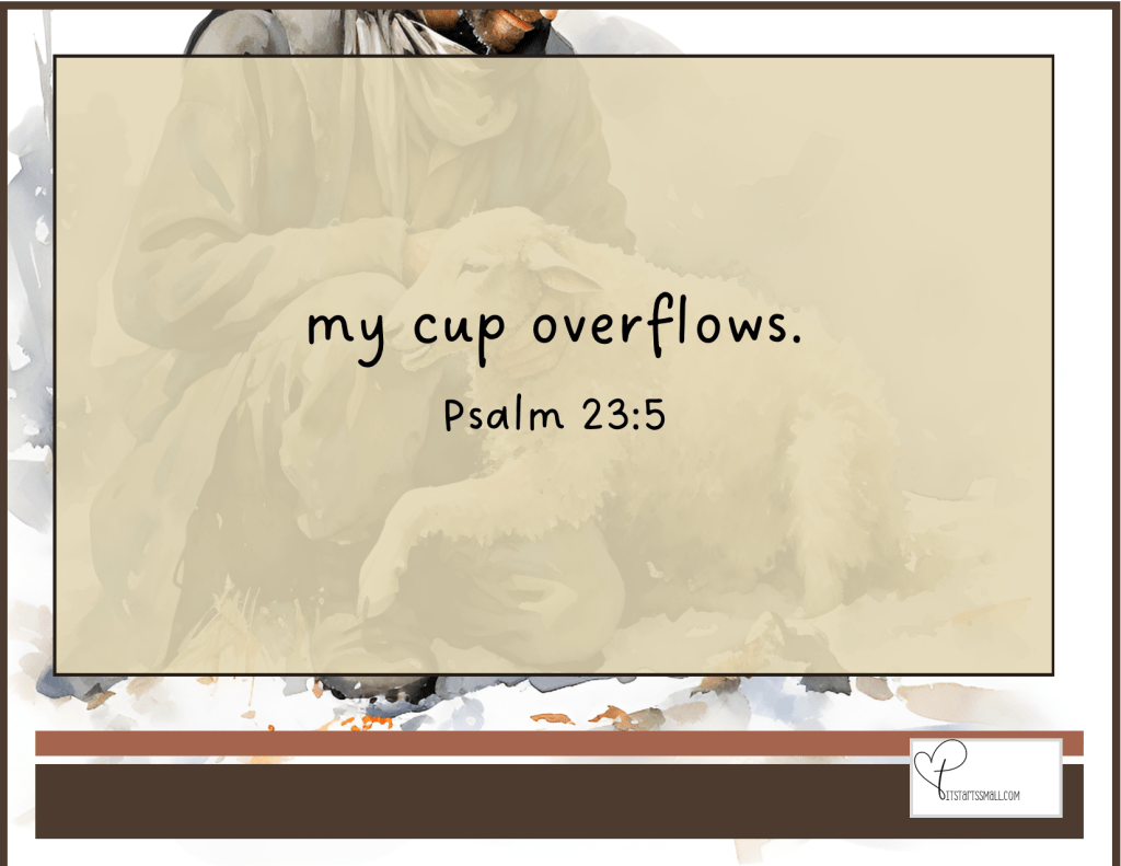 Not only is David’s “cup” described as full to the brim, but it is also running over. Based on the host-guest relationship, this imagery clearly teaches that God provides much more than expected. Some people may read this part of the verse and think material blessings of food, shelter, and money are intended.