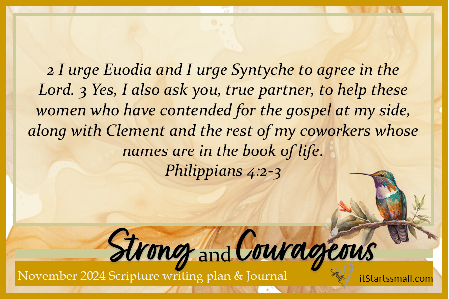 Euodia and Syntche partnered with Paul in the spread of the gospel message. He urged them to communicate with care. These sisters in Christ were encouraged to settle their disagreement and focus on their calling to influence the world for Christ.