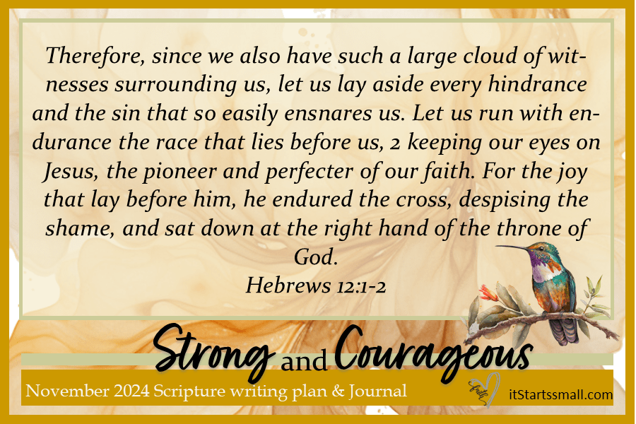 Once we acknowledge the challenge that keeps us trapped in fear, we can begin putting forth daily practices that help us overcome our apprehension to embrace God and His God given opportunities. We must ALWAYS remember that Christ calls us to lay aside our hindrances and pursue His will. We do this by keeping our eyes on Him. He is the One who perfects our faith and gives us courage. He sees us through. (Hebrews 12:1-2)