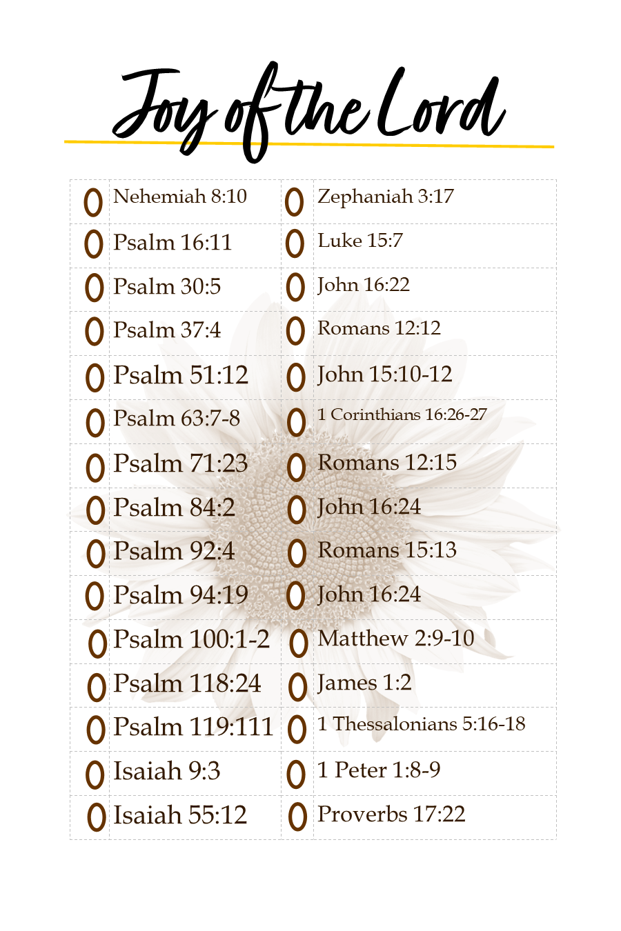 This set of scriptures is focused on the Joy f the Lord! Renew the joy of the Lord by studying and meditating on these 30 verses.
