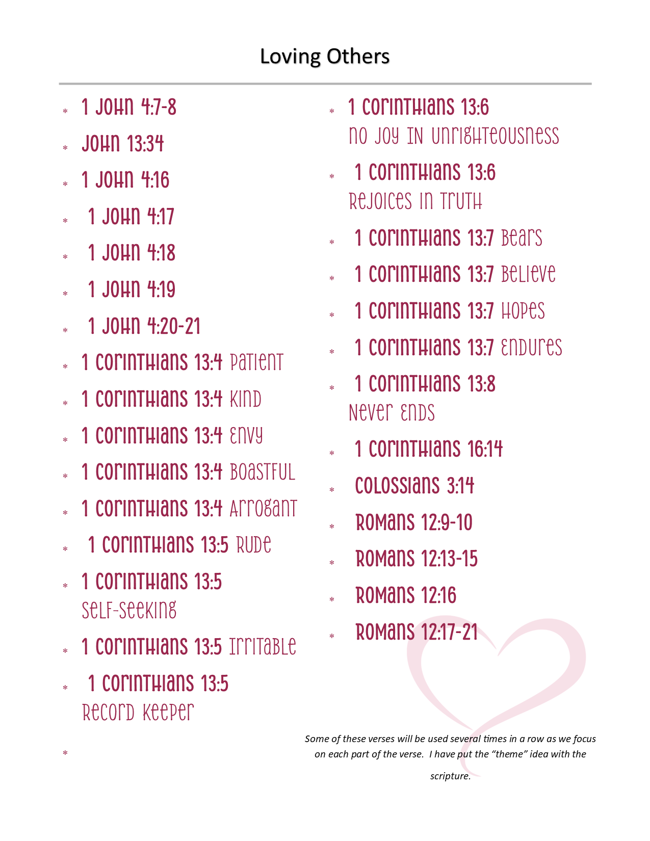 This scripture plan explores God’s Word for instruction and examples of how we are to love others, to include our enemies. God is perfect love. It is only by allowing Him to fill our hearts can we love others. When we are filled with His love, what do we do with it? God’s Word gives us perfect details on how we are to not only love Him, but love others.