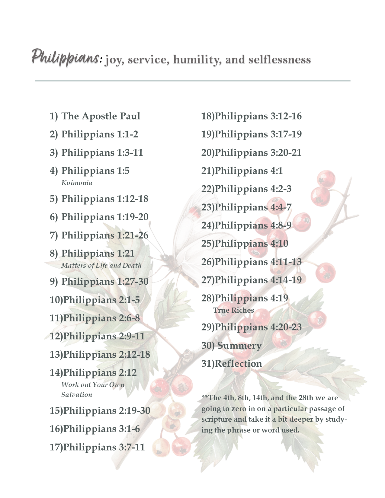 The journal has extra pages than what you will see with the posted blog series. The first day is a day to research the author, Paul, and do your own research on the church in Philippi. At the end of the journal is a summery and reflection page. It gives you a chance to summarize your learning of the book of Philippians.